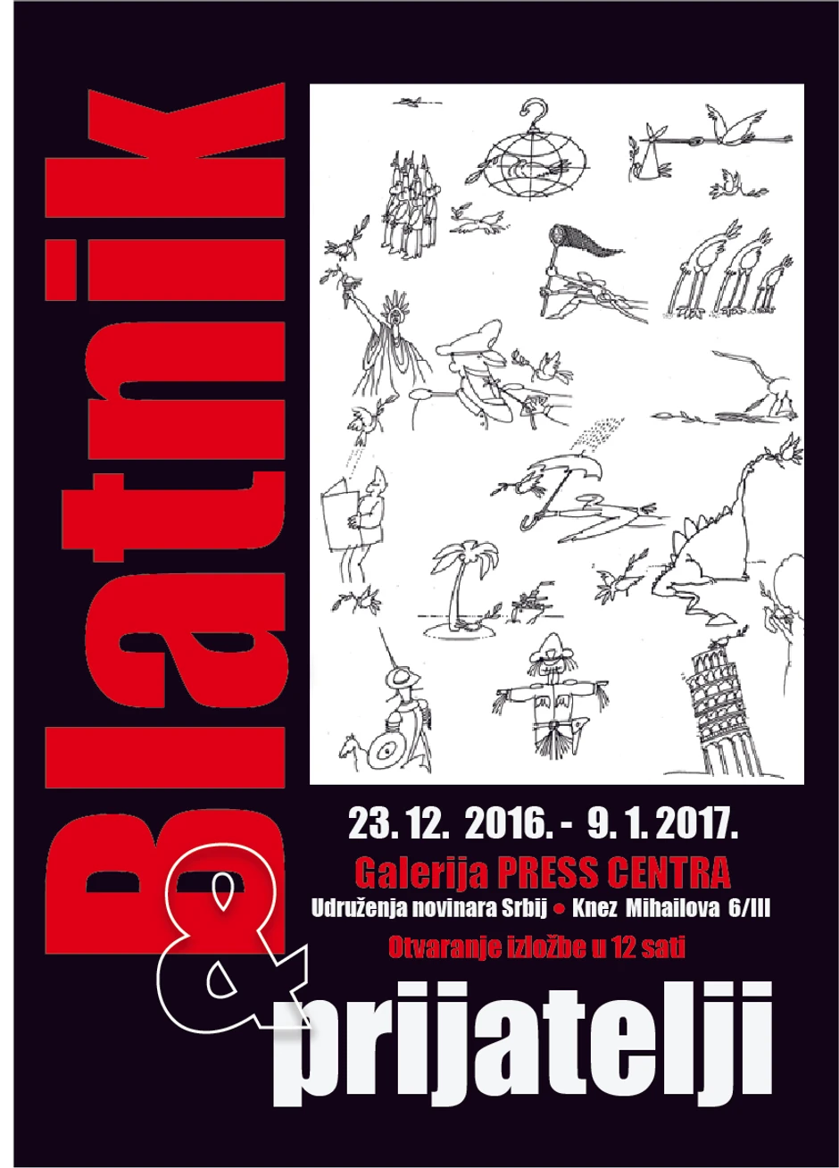 Na izložbi će biti predstavljno 30 odabranih karikatura Aleksandra Blatnika dok će njegove kolege Dušan Petričić, Jugoslav Vlahović, Toša Borković, Mileta Miloradović, Goran Čeličanin, Ranko Guzina, Nikola Kostadinović, Zoran Mihajlović, Muhamed Đerlek, Zoran Jovanović, Ljubomir Sopka, Nedeljko Ubović... svojim delima uveličati postavku koja će biti otvorena do 9. januara.