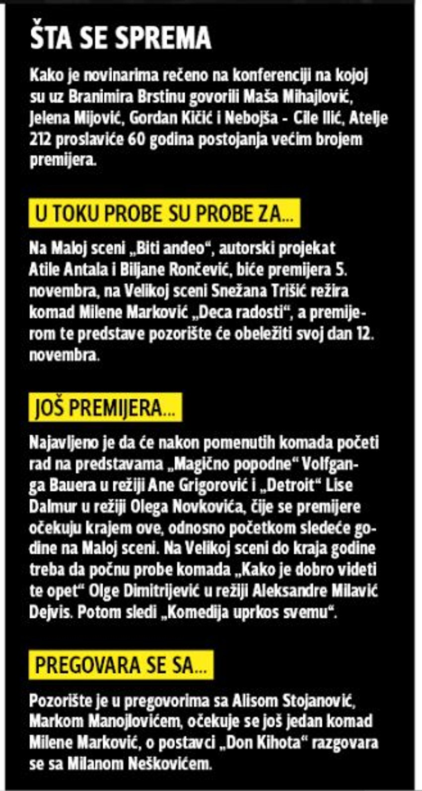 - Ovde sam sada, ovde sam počeo, ovde... da ne pričamo sad o završetku. Sve ono što ovo pozorište znači, svi oni biseri dramske umetnosti koje je iznedrilo i koji su ga stvarali, sve to dodatno motiviše da čovek radi odgovorno, posvećeno - a i kako je govorio profesor Minja Dedić - veselo, bodro i umetnički. Jubilarnu, 60. sezonu obeležićemo premijerama - naglasio je Brstina.