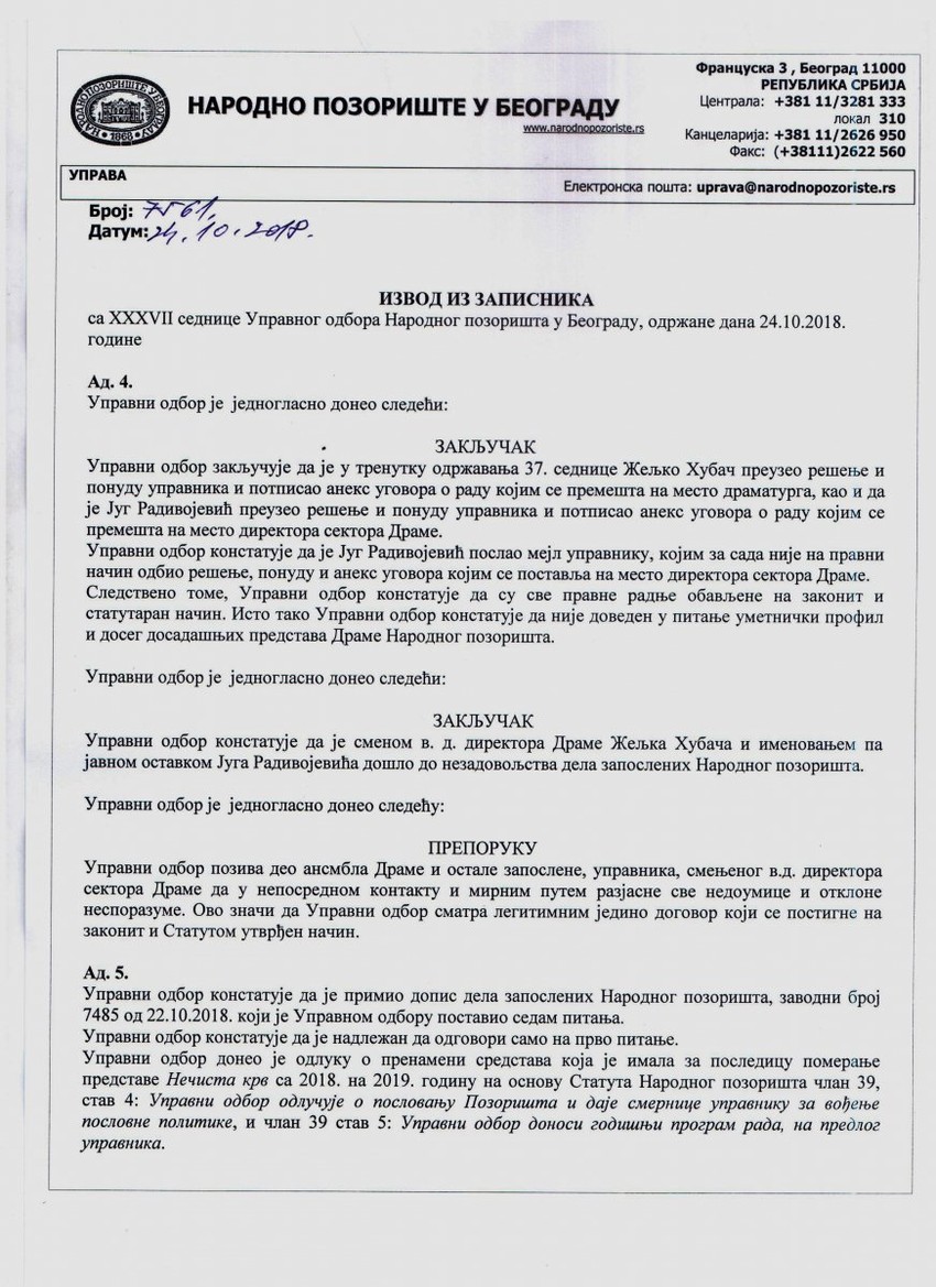 Željko Hubač je na sednici potpisao aneks ugovora o radu kojim se premešta na mesto dramaturga Narodnog pozorišta, a Jug Radivojević potpisao aneks ugovora o radu kojim se premešta na mesto sektora direktora Drame. Sve pravne radnje tako su obavljene na zakonit i statutaran način, navodi se dalje u zapisniku sa sednice UO, a konstatovano je i da nije doveden u pitanje umetnički profil i doseg dosadašnjih predstava Drame.