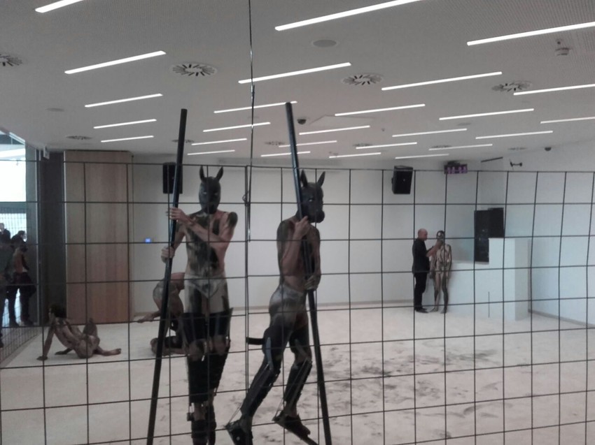 Oni izvode performans u sali za predavanja, samo u vešu i na štulama, u improvizovanom kavezu. Godani je za "Blic" izjavio da je koreografiju osmislio kao komunikaciju sa izložbenim prostorom i eksponatima.