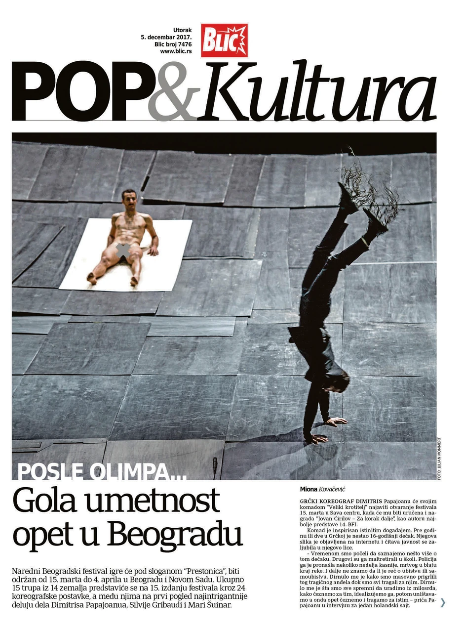 - Posle "Olimpa" Jana Fabra teško da nešto može da nas šokira. To će pokušati slavni Dimitris Papajoanu (radio otvaranje Olimpijskih igara u Atini 2004.), Mari Šiunar, direktorka Bijenala igre u Veneciji i jedna šarmantana igračica punijeg stasa iz Milana. Šta je u njihovim radovima toliko šokantno?