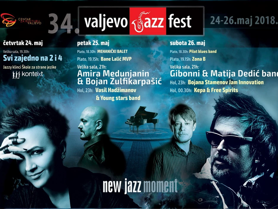 Kompletan program 34. Džez festa i ove godine odvijati na tri scene - na platou ispred Centra za kulturu, velikoj sali Centra i Art holu. Tako će u petak 25. maja, pre koncerta Amire Medunjanin i Bojana Zulfikarpašića na velikoj sceni, ispred Centra za kulturu nastupiti Bane Lalić i MVP, a nakon Amirinog i Bojanovog koncerta publika će moći da sluša Vasila Hadžimanova sa Young Stars bendom, mladim džez muzičarima sa Univerziteta Berkli u SAD.