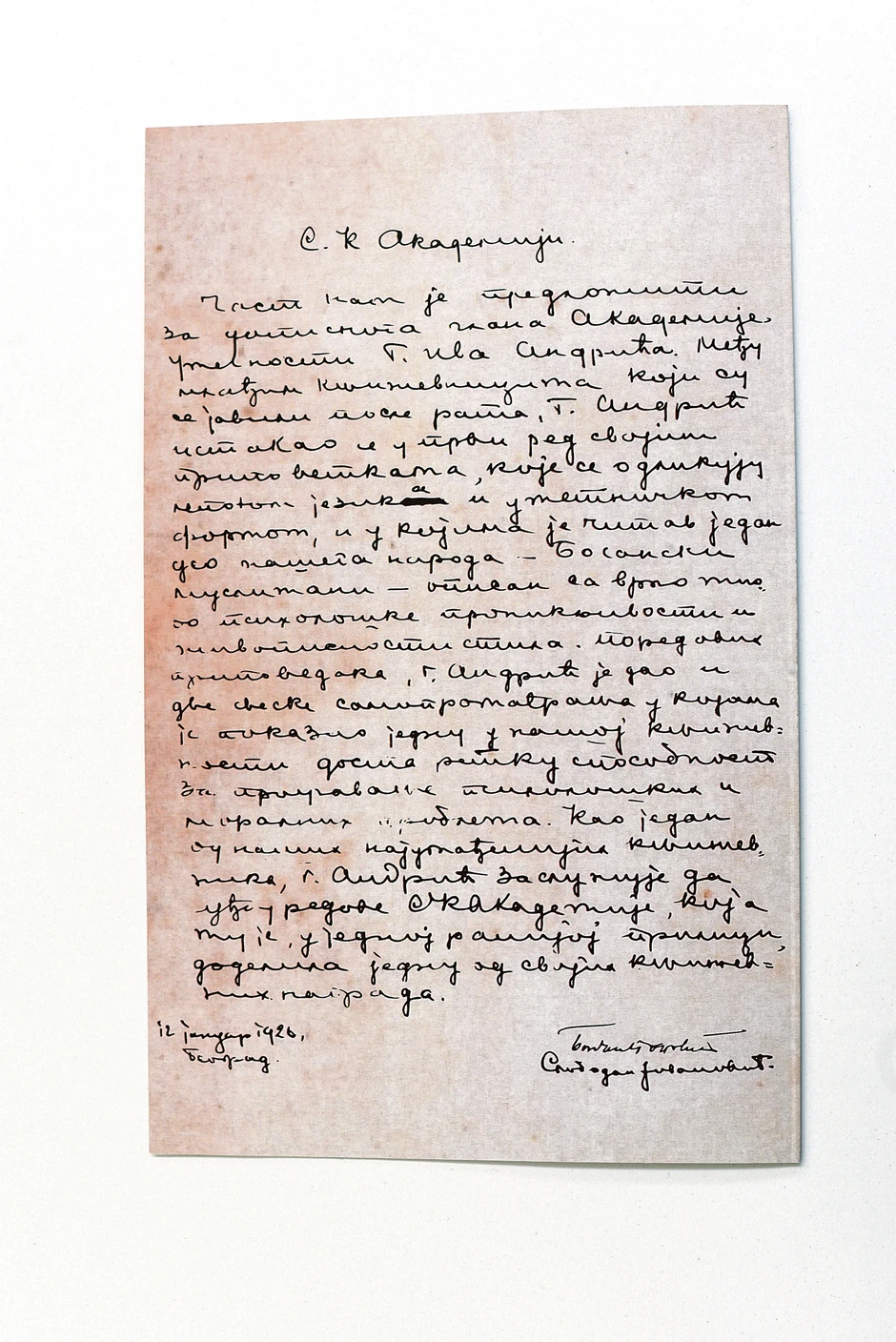 "Čast nam je predložiti za dopisnoga člana Akademije umetnosti g. Iva Andrića. Među mlađim književnicima koji su se javili posle rata, g. Andrić istakao se u prvi red svojim pripovetkama koje se odlikuju lepotom jezika i umetničkom formom, i u kojima je čitav jedan deo našega naroda - Bosanski muslimani - opisan sa vrlo mnogo psihološke pronicljivosti i živopisnosti stila. Pored ovih pripovedaka, g. Andrić je dao i dve sveske samopromatranja u kojima je pokazao jednu u našoj književnosti dosta retku sposobnost za proučavanje psiholoških i moralnih problema. Kao jedan od naših najuglađenijih književnika, g. Andrić zaslužuje da uđe u redove S. K. akademije koja mu je u jednoj ranijoj prilici dodelila jednu od svojih književnih nagrada. 12. januar 1926, Beograd. Slobodan Jovanović, Bogdan Popović.”