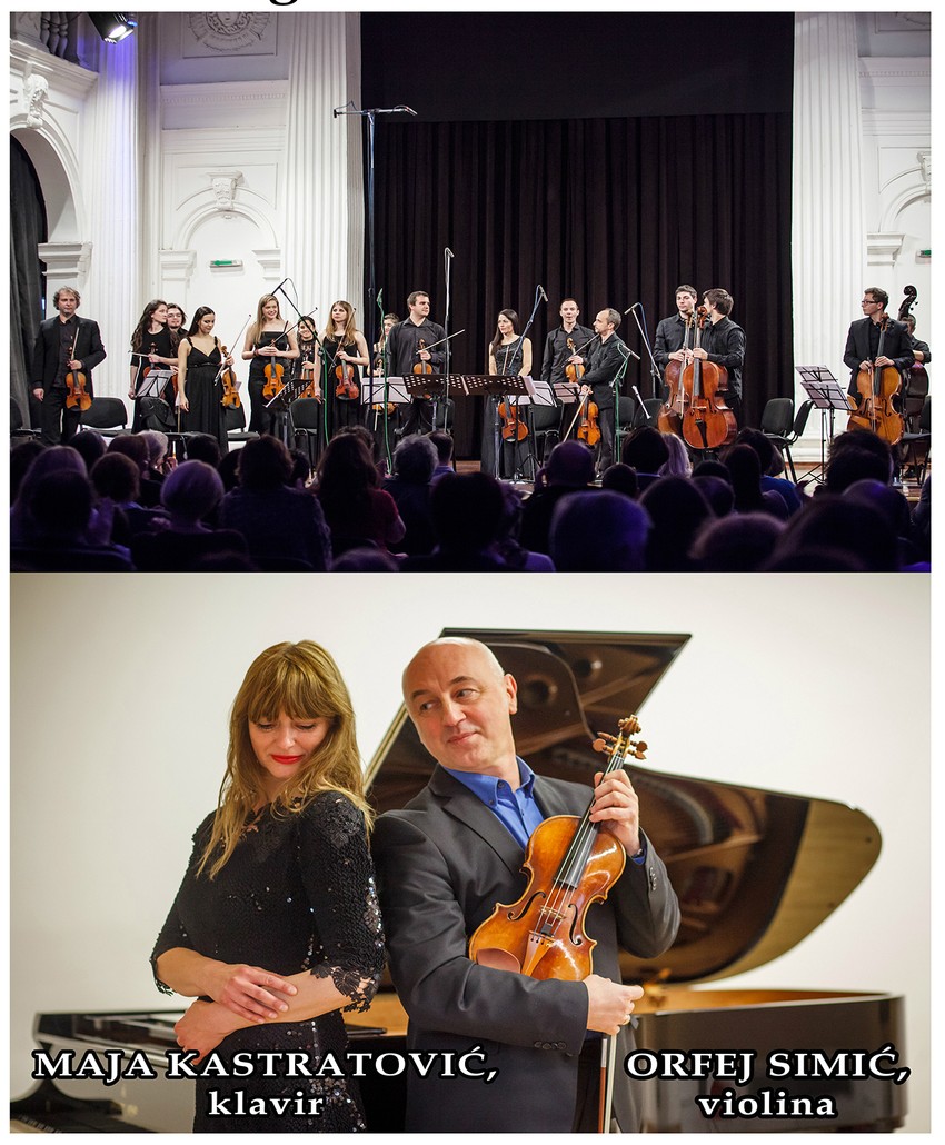 Kao solisti će nastupiti violinista Orfej Simić (Austrija) i pijaniskinja Maja Kastratović (Slovenija). Na programu su dela Zorana Erića (Cartoon), Mendelsona (koncert za violinu, klavir i gudače) i Šostakoviča (Kamerna simfonija op.110).