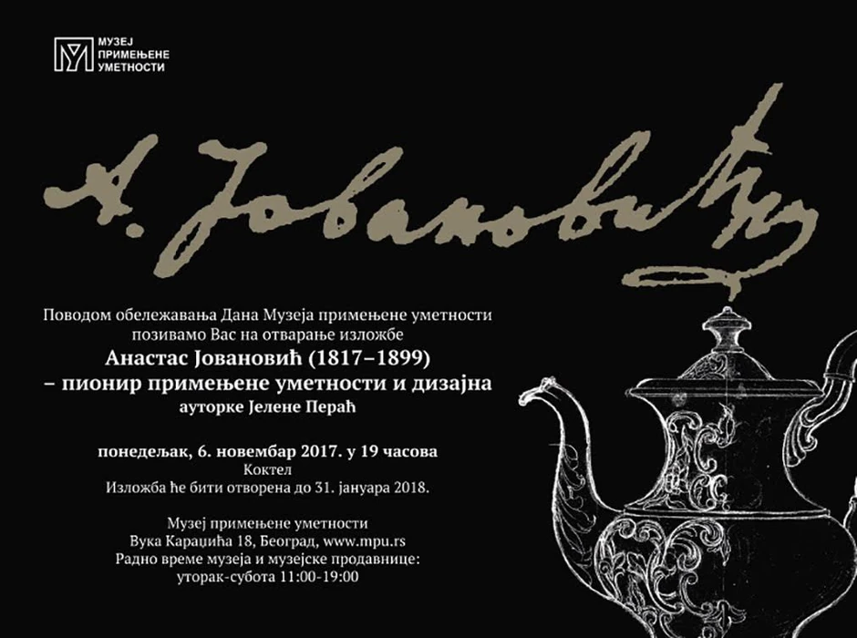 Povodom obeležavanja dva veka od rođenja Anastasa Jovanovića, Muzej primenjene umetnosti predstaviće do 31. januara 2018. nacrte iz svoje i iz kolekcije Galerije Matice srpske u Novom Sadu, kao prva i jedinstvena dizajnerska rešenja vezana za našu sredinu.