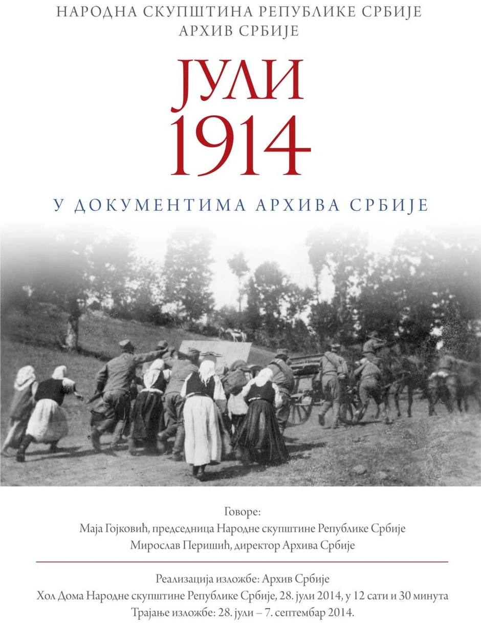 Izložba pod nazivo "Juli 1914. u dokumentima Arhiva Srbije" biće otvorena u ponedeljak, 28. jula, 12.30 sati u holu Doma Narodne skupštine, najavljeno je iz Arhiva Srbije.