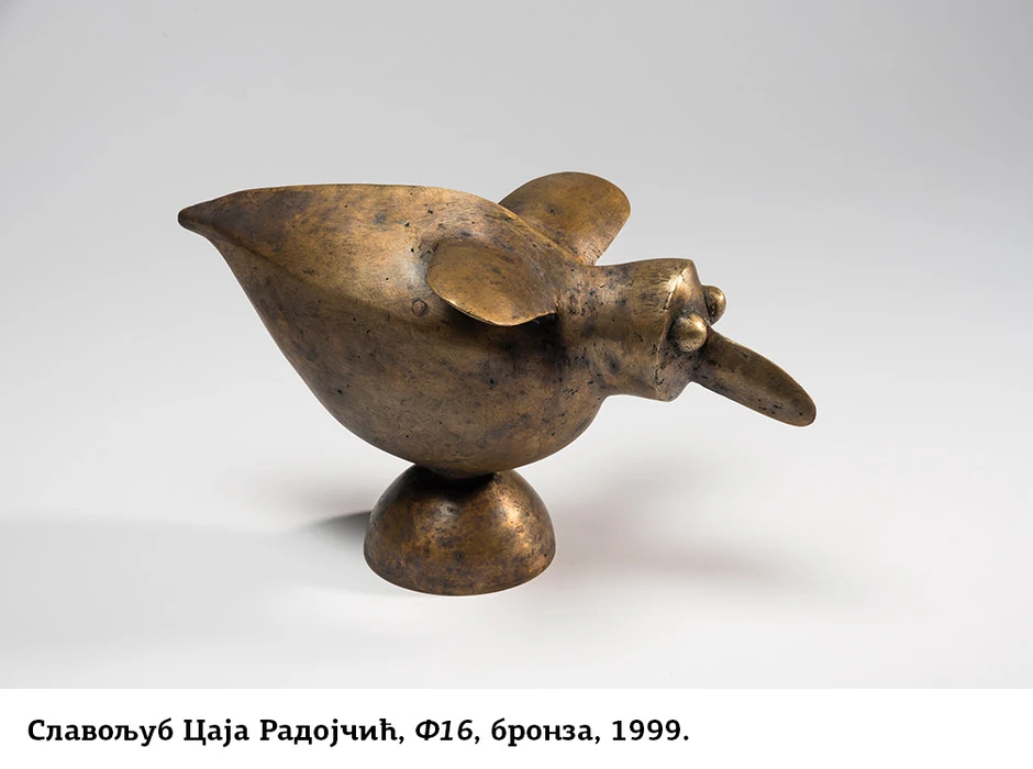 Na aktuelnoj izložbi u Likovnoj galeriji KCB-a predstavljeno je petnaestak skulptura malog formata, uglavnom bronzi, memorijalnog karaktera, iz perioda 2011-2018, koje do sad nisu izlagane u Beogradu. Među njima su: makete za spomenik Nikoli Tesli u Budimpešti, spomenik NATO-bombardovanju, Trubaču, memorijali posvećeni književniku Brani Petrovići, U čast Mocarta, skulpture Planeta sreće i radosti, Komunista, Kaćuša, Papuče za moju dragu itd. Na izložbi će takođe biti izloženo i deset crteža, rađenih kombinovanom tehnikom (akvarel, pastel, akrilik) na papiru, koji su nastajale u isto vreme kad i skulpture, a rađeni su u stilu Cajine prepoznatljive figuracije i tematike bazirane na ironiji, anegdoti i dosetki.