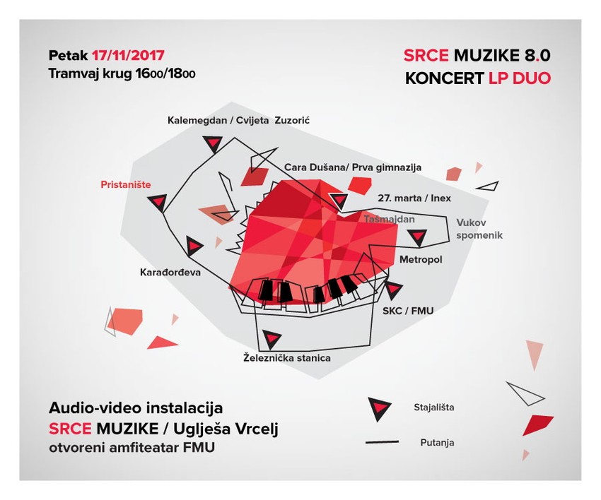 Umetnički performans povezan je sa audio-video instalacijom "Srce muzike" postavljenom na otvorenoj sceni amfiteatra ispred Fakulteta muzičke umetnosti, kojom se ukazuje na aktuelne potrebe ove institucije za nabavkom novih klavira za nastavu.