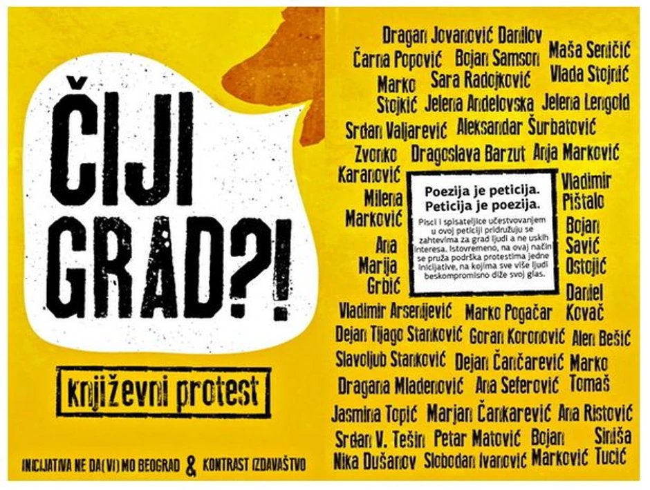 Inicijativa "Ne da(vi)mo Beograd" dobila je podršku više od 40 pisaca kroz zbirku "Čiji grad?!", a celokupan prihod od njene prodaje biće doniran za "rast te neformalne gradjanske organizacije i organizovanje novih protestnih šetnji".