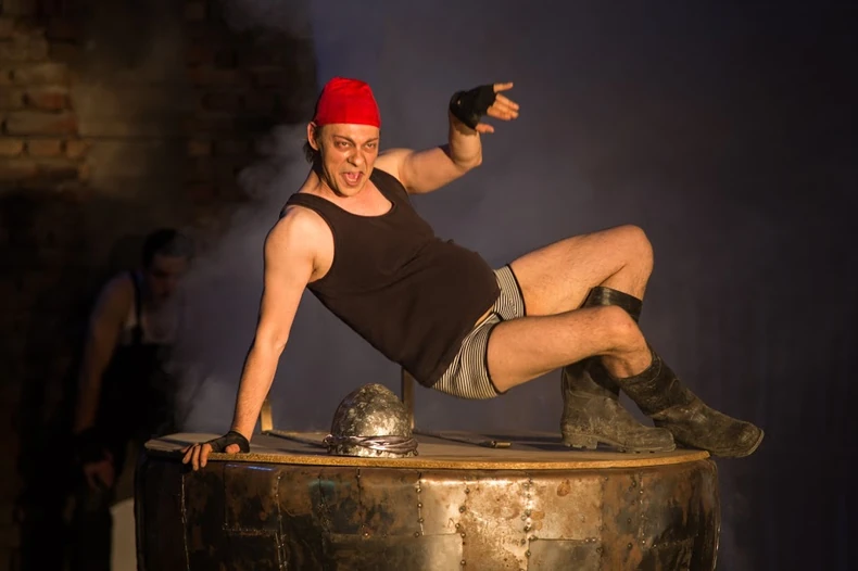 Predstava je rađena po tekstu Alfreda Žarija, jednog od najzanimljivijih autora s pocetka 20. veka, tvorca pata fizike, koji u sebi objedinjuje vodviljsko delo sa skaradnim, razuzdanim humorom, istovremeno uspevajući da jednim novim humorističkim postupkom pokaže surovu stranu ljudske prirode, što je bio značajan i prvi slučaj na svetskoj pozornici i u umetnosti uopšte.