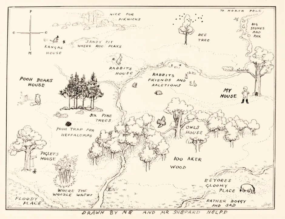 Šarmantna detinjatost Kristofera Robina prikazana je namerno nespretno ispisanim nazivima lokacija kao i kompasom sa slovima Puovog preizmena. Šepardova zabavna ličnost takođe je deo ilutsracije jer je mapa potpisana rečima "Nacrtao ja a g-din Šepard pomogo".