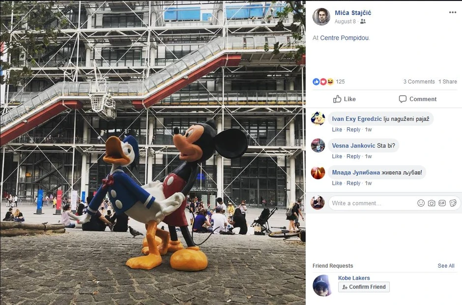 Radi se o skulpturi umetnika Milorada Stajčića na kojoj su prikazane figure Mikija Mausa i Paje Patka u pozi koja asocira na seksualni čin. One su postavljene ispod fotografije Belog anđela iz manastira Mileševa, koja se nalazi na ulazu u Kulturni centar Srbije. Kako su izvestile “Večernje novosti” njima su se javili Srbi iz Pariza razočarani činjenicom što su se Diznijevi junaci u “nezgodnoj pozi” našli u izlogu Kulturno-informativnog centra Srbije. Nakon toga je usledila reakcija Ministarstva kulture.