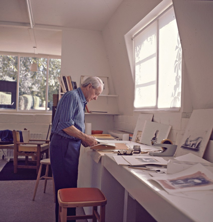 - Da, to nisam videla u njegovim prethodnim ateljeima i kućama koje je imao, niti u ateljeu u Londonu. Tek kada je počeo da pravi makete, čak i kada je počeo da radi male prikaze porodice, je počeo da gradi svoj rečnik. Možete videti kako ga istražuje u svojim crtežima, skicama i zapisima. To je proces koji pokreće intelekt.