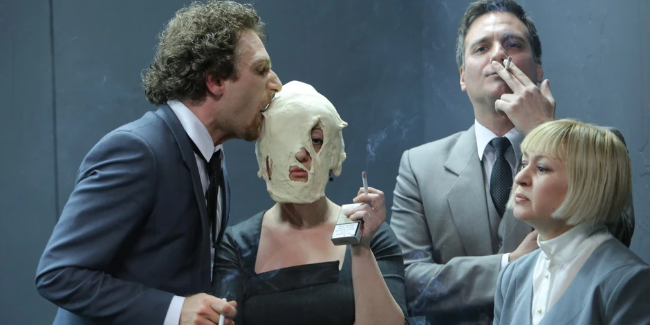 Sivi zidovi, sive klupe, glumci u sivim odelima, na sceni se brzo smenjuju različite emocije i raspoloženja - paničan smeh, strah, plač, ludilo, na površinu izbijaju potisnute frustracije.