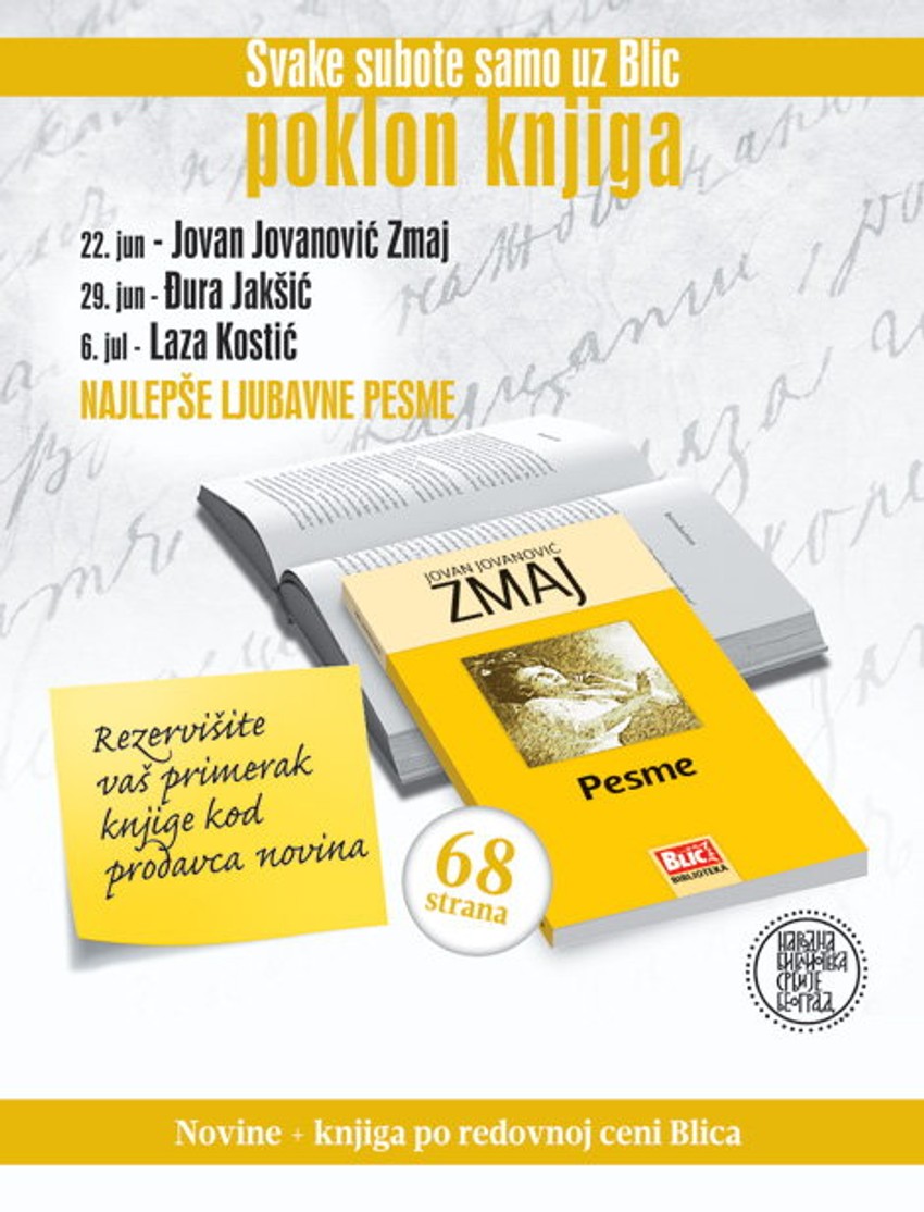 Nakon poklon knjige Jovana Jovanića Zmaja, slede najlepše ljubavne pesme Đure Jakšića (29. jun), Laze Kostića (06. jul). Rezervišite vaš primerak knjige kod prodavca novina! Čitajte Blic!
