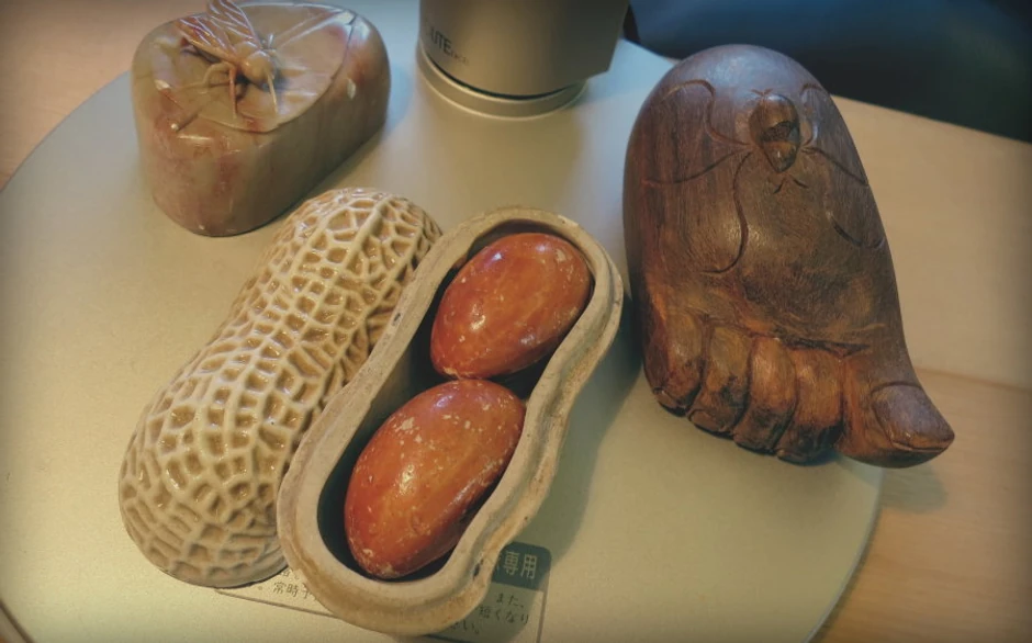 Drveno stopalo sa urezanim paukom je iz Laosa, mermerni kamen sa pčelom iz Skandinavije a posuda u obliku kikirikija... hmmm... izvinite, zaboravio sam. To su moji talismani.