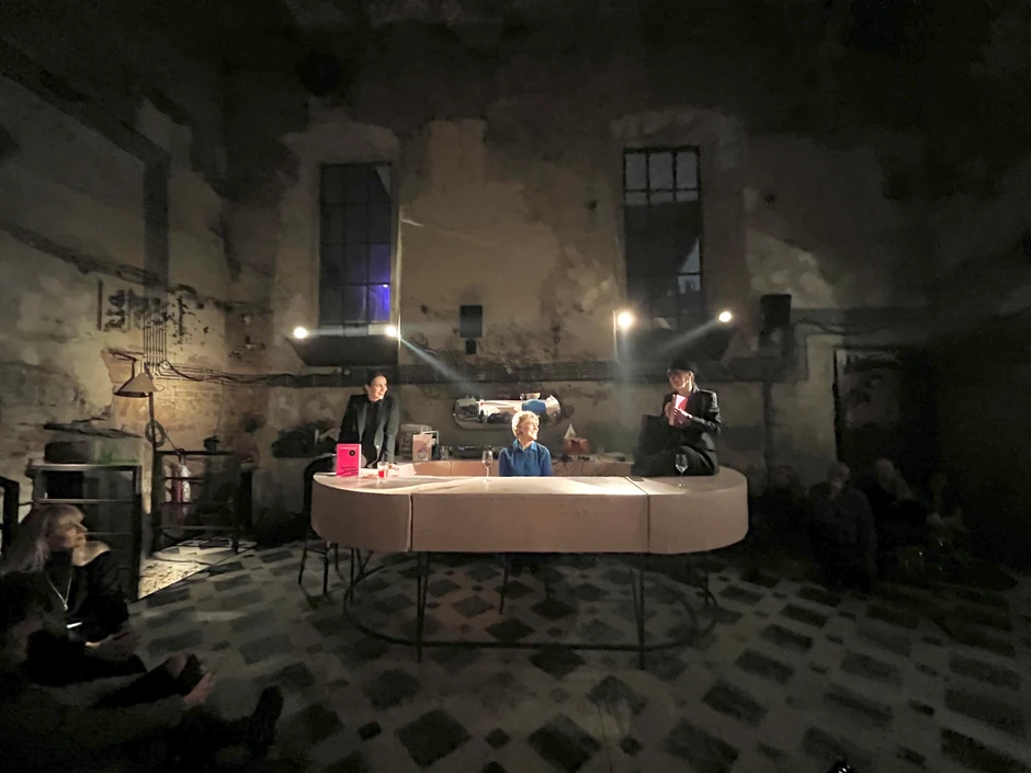 Na velikom roze stolu sedele su pored autorke, Tatjane Ćalasan, glumica Nada Šargin i Maja Uzelac, koja je moderirala program, a za gramofonima DJ FUNKcioner.