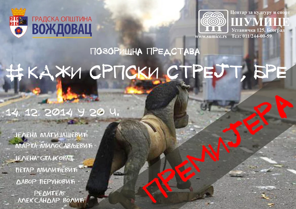 Problemi gimnazijalaca, nevaspitanje, droga i alkohol, belo roblje i kič u kome žive samo su delovi potresnog komada „Kaži srpski strejt, bre“ koji će se premijerno igrati 14. decembra u 20 časova u pozorištu „Šumice“.