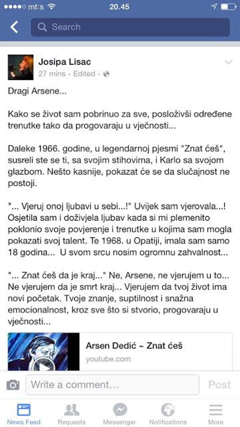 - “Vjeruj onoj ljubavi u sebi!...” Uvijek sam vjerovala...! Osjetila sam i doživjela ljubav kada si mi plemenito poklonio svoje povjerenje i trenutke u kojima sam mogla pokazati svoj talenat. Te 1968. u Opatiji imala sam samo 18 godina... U svom srcu nosim ogromnu zahvalnost... - napisala je, između ostalog, pevačica Josipa Lisac na svom tviter nalogu, u poruci naslovljenoj sa “Dragi Arsene”.