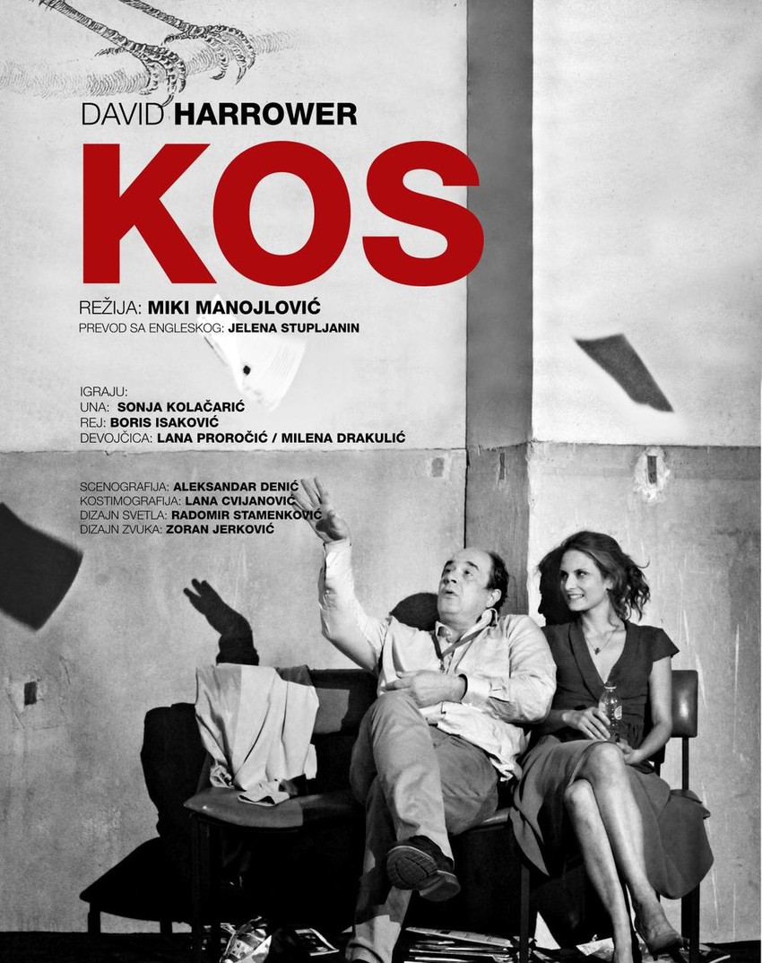 "Kos" je na programu 13. i 21. 10. u 20:30h. Predstava Dejvida Harouera u režiji Mikija Manojlovića premijerno je izvedena 8. juna 2017. Glumačku postavu čine Sonja Kolačarić i Boris Isaković i dve devojčice u alternaciji: Lana Proročić i Milena Drakulić.