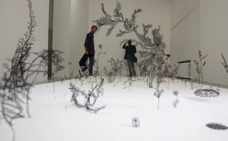 - Koristili smo modifikovanu verziju tradicionalnog veza. Ja bih na podlozi iscrtala biljku, onda bismo je izvezli i potom uklonili osnovu, odnosno tkaninu. Tako ostaje samo crna nit i žica koja je podržava. Bilo mi je važno da to cvetno polje bude puno vazduha i prostora, da biljke deluju kao da su tu, a u stvari nisu, kao nešto krhko, vazdušasto, delikatno - ističe Indijka.