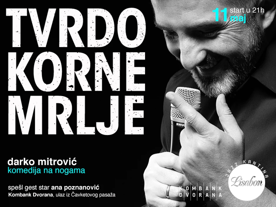 U Kombank dvorani, u džez kantini Lisabon, 11. maja (21) Darko Mitrović izvešće svoju novu stend-ap komediju pod nazivom "Tvrdokorne mrlje".