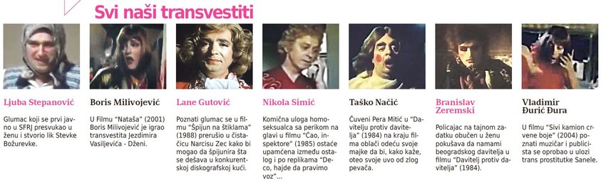 Još od vremena Ljube Stepanovića i prostosrdačne narodske junakinje Stevke Božurevke, preoblačenje muškaraca u žensku odeću proizvodilo je komičan efekat i taj motiv činio prihvatljivim, tačnije detaljem koji ukazuje da je reč o nespornoj komediji. O tome svedoči i korišćenje travestije u popularnim srpskim komedijama iz osamdesetih godina (“Davitelj protiv davitelja”, “Idi mi, dođi mi” i “Špijun na štiklama”). Zanimljivo je i korišćenje travestije u televizijskoj seriji “Levaci”, u kojoj scenarista Ljubiša Kozomora na gorkosmešan način tretira lik Tase (igra ga Slavko Simić), i u jednoj epizodi taj junak se preoblači u ženu i svom sestriću predstavlja kao tetka.