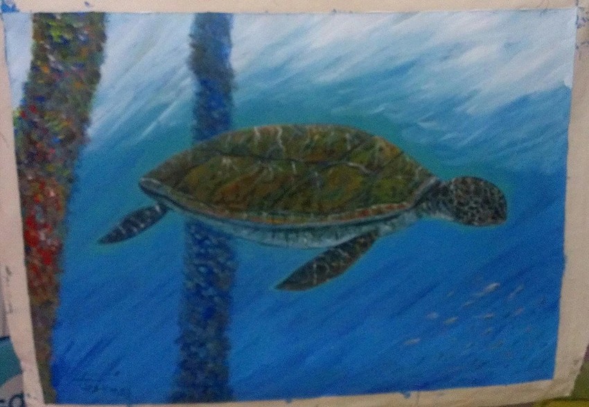 On je naslikao delfine, kornjače, šarene ribe koje su plivale pored njega, koralne grebene, alge i razna druga bića koja žive na morskom dnu.