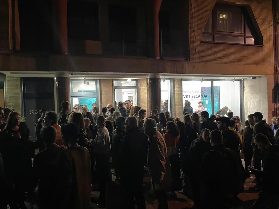 Ulica Dositejeva ispred beogradske galerije Sanjaj bila je u utorak uveče zakrčena zbog velike gužve tokom otvaranja izložbe „Vrt sećanja“ mladog umetnika Veljka Valjarevića iz Užica.