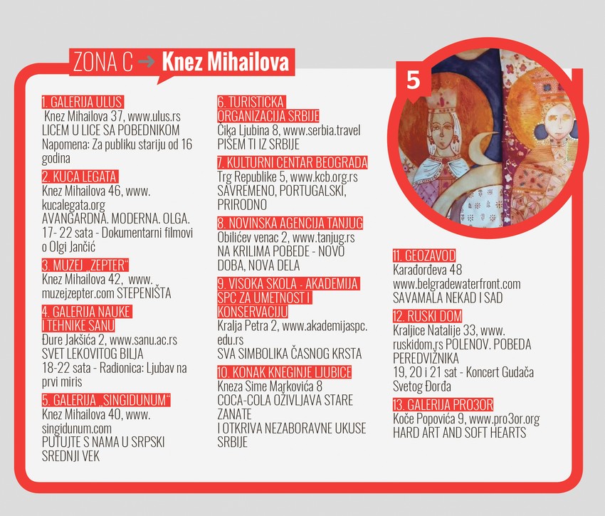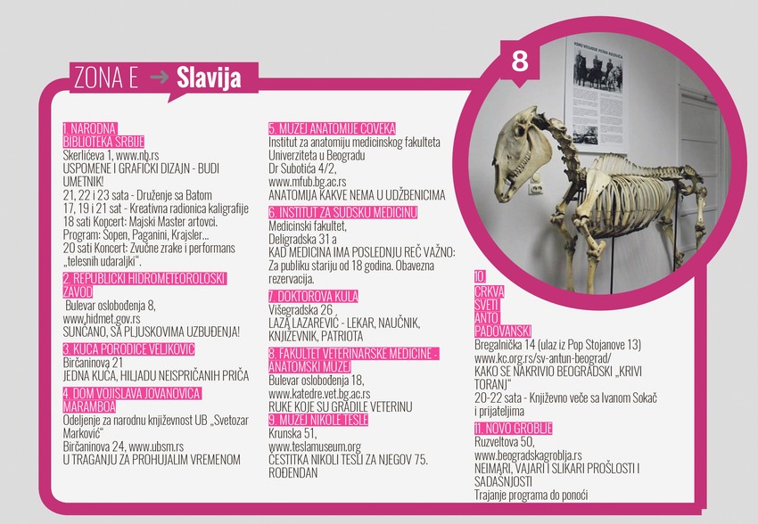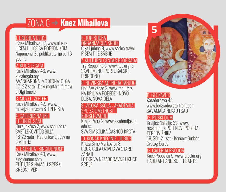 Osim velikih postavki u poznatim muzejima i galerijama, za beogradsku Noć muzeja su i pažljivo osmišljeni, skriveni dragulji namenjeni otkrivanju nekih novih, pomalo zaboravljenih prostora i neispričanih priča. Večeras će posetioce ove manifestacije prvi put primati Bajrakli džamija, Crveni krst premijerno otvara svoja vrata, a manifestaciji se ekskluzivno pridružuje i Radio Beograd 2.