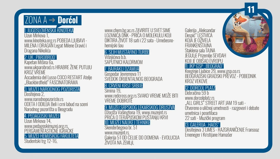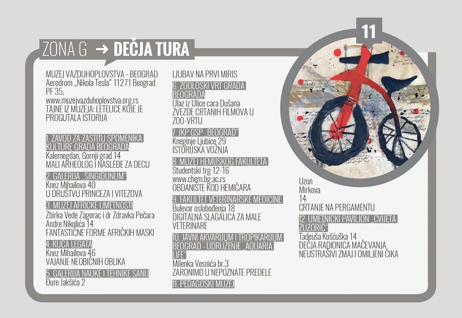 Uz tradicionalne beogradske ture "Dečje priče", "Beograd sa stilom" i "Neispričane priče", ove godine uveden je i program "Umetnik je prisutan". Na više lokacija posetioce će dočekivati umetnici, vodeći ih kroz svoje izložbe, družeći se sa njima i razgovarajući o svojim delima, inspiraciji i pričama koje kriju. Neki od njih stvaraće na licu mesta.