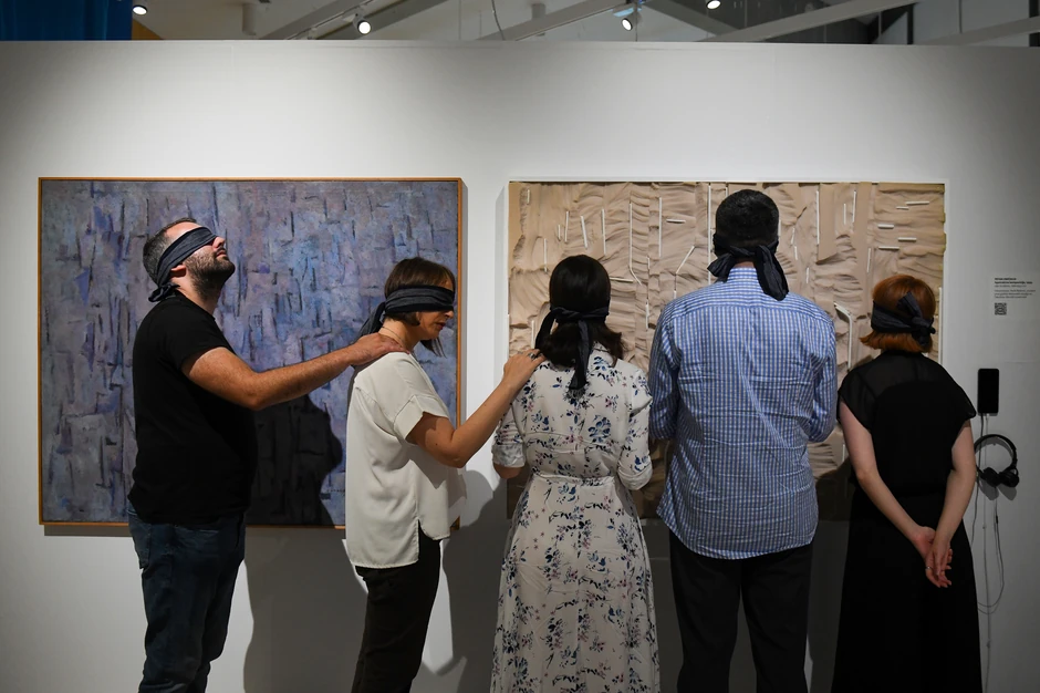 Vođenje na neviđeno kroz „Plavu izložbu“ odvija se tako što videća publika stavi poveze na oči, koristeći taktilne staze za kretanje kroz prostor izložbe i prateći uputstva vodiča Borisa Dončića, upušta se u avanturu višečulne šetnje i jedinstvenog iskustva.