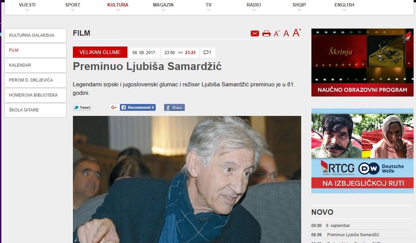 RTCG prenosi takođe da je otišao legendarni srpski i jugoslovenski glumac i režiser i podseća da su među zapaženijim ulogama bili filmovi "Bitka na Neretvi", "Sutjeska", "Bombaši", "Ljubavni život Budimira Trajkovića", "Lude godine", "Rad na određeno vreme", "Moj tata na određeno vreme", "Nije lako sa muškarcima", "Magareće godine", "Ubistvo sa predumišljajem", "Nataša", "Konji vrani"...