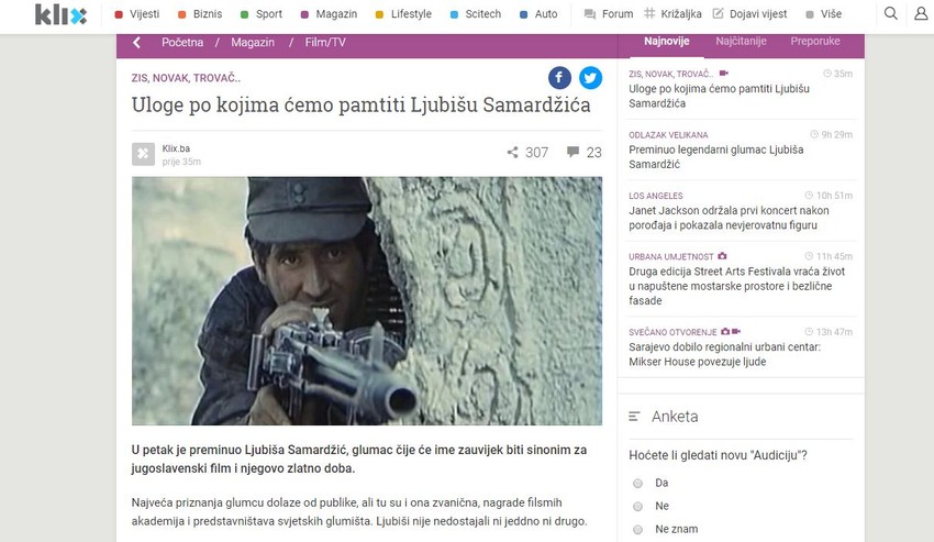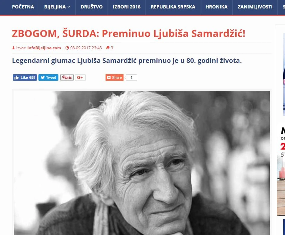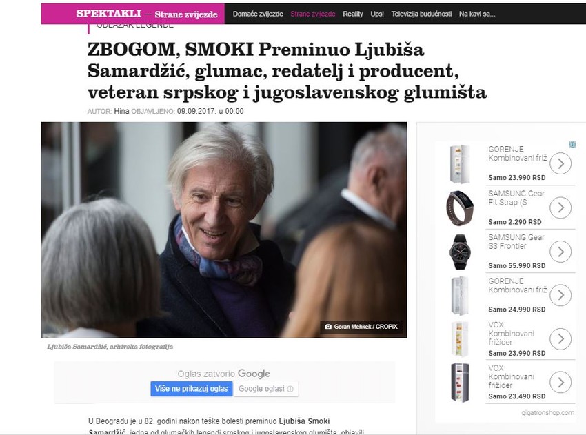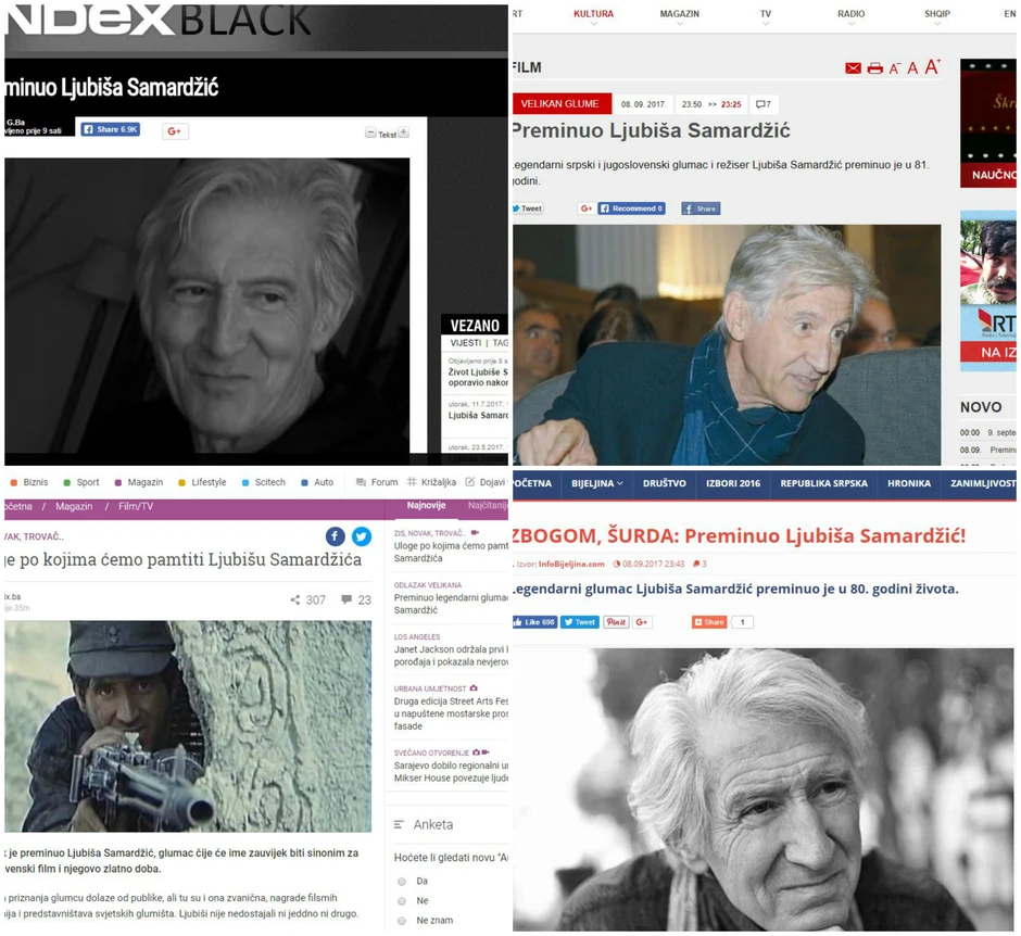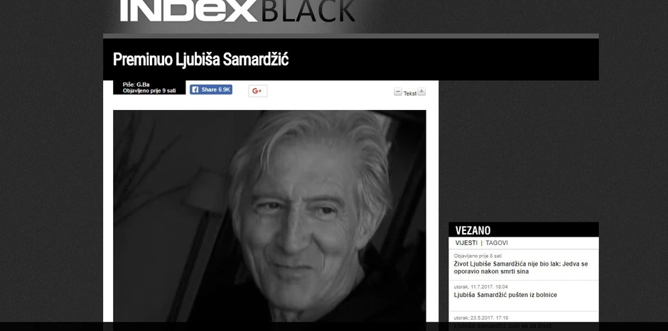 Portal Index.hr takođe piše da je legenda jugoslovenske i srpske kinematografije Ljubiša Samardžić preminuo u 81. godini života.