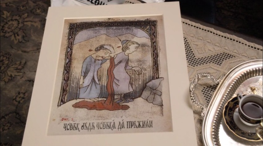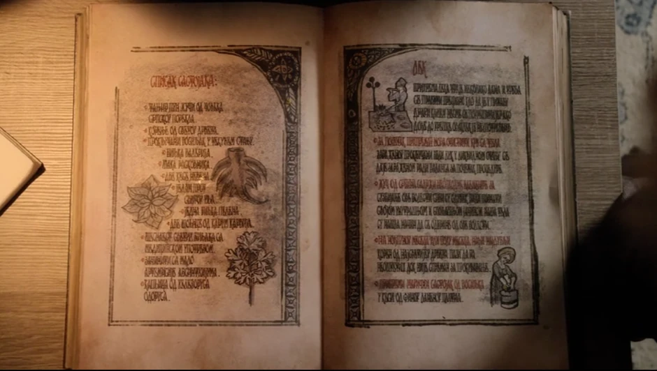 Lek za tu bolest, koja je harala pre 500 godina u srpskom selu "Pozika" (u originalu Pozica - ne znamo da li je grad namerno izmišljen ili je reč o pogrešnom spelovanju Božice ili Požege) nalazi se u knjizi sa ilustracijama obolelih i natpisima na srpskoj ćirlici, ne uvek vešto prevedenih.