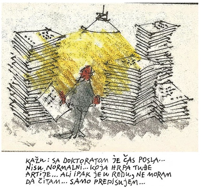 Prepisivanje tuđeg dela, otimanje znanja i samoprezentacija putem ukradenog rada je postalo praksa, tolerisana od institucija koje treba da kažnjavaju počinioce prepisivačke rabote. Potreba pojedinih članova novokomponovane elite da se kroz takvu nečasnu radnju unaprede, dostignu bolji položaj, prihvaćena je kao čin koji se ne kvalifikuje kao krađa, već se nečasni postupak uvodi u legalni rečni tok, a prepis gomile tuđe hartije učinjen čak i bez čitanja je dozvoljen, posebno kada su u pitanju vlastima podobni i pogodni pojedinci.