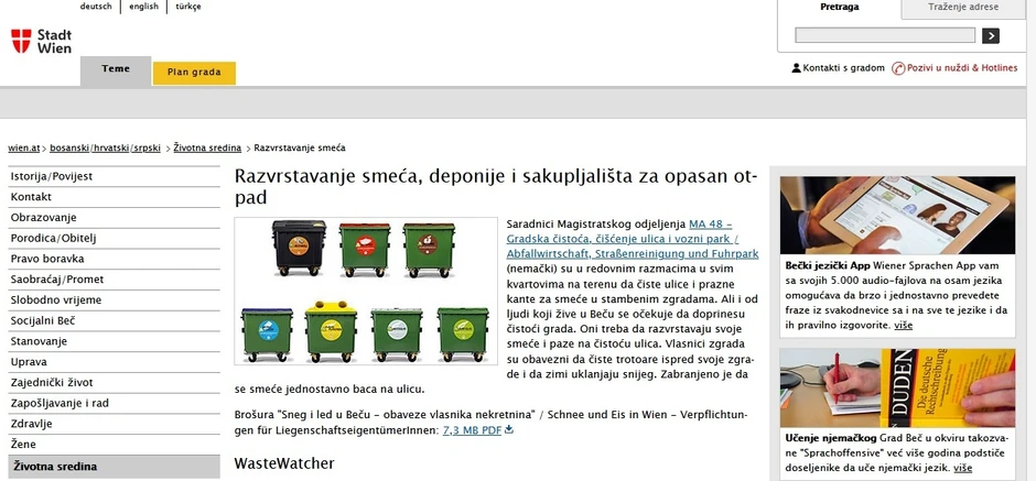 - Bečka „gradska čistoća“ ili ti „MA 48“ i grad Beč osnovali su servisni kol centar „Misttelefon“ odnosno telefon za informacije o smeću, gde operateri svakoga dana od ponedeljka do subote u periodu od 8h do 18h građanima odgovaraju na pitanja vezana za odlaganje, reciklažu i ponovnu upotrebu otpada. Kako bi se informisanje javnosti dodatno unapredilo, sve servisne informacije dostupne su i na sajtu grada Beča, kao i u raznim štampanim brušurama koje se distribuiraju stambenim zajednicama. Takođe, sve informacije od važnosti dostupne su kako na nemačkom i engleskom jeziku, tako i na jezicima najzastupljenijih nacionalnih manjina: srp, hr, bih, turski. Na taj način je svaki stanovnik Beča, bez obzira na stepen obrazovanja, obuhvaćen sistemom informisanja na svom maternjem jeziku, odnosno jeziku kojim se u svakodnevnom govoru služi, - naglašava Milica Lukić i upućuje na sajt Grada Beča, stranicu na srpskom jeziku https://www.wien.gv.at/bh-hr-sr/zivotnasredina/smece/