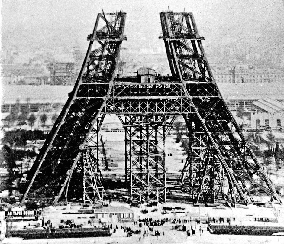 Najpre su građeni temelji zahvaljujući kojima pritisak na zemlju iznosi 4,5 kg po cm kvadratnom, što je odgovarajuće vrednosti težine jednog čoveka koji sedi na stolici. Montaža metalnih delova je počela u julu 1887. godine. Montaža je rađena pomoću dizalice koja je podizala elemente do visine od 30 metara. Dana 7. decembra je bila gotova prva platforma na 57. metru visine, dok je druga platforma podignuta na sličan način na visini 115 m i bila završena u septembru 1888, piše Vikipedija.