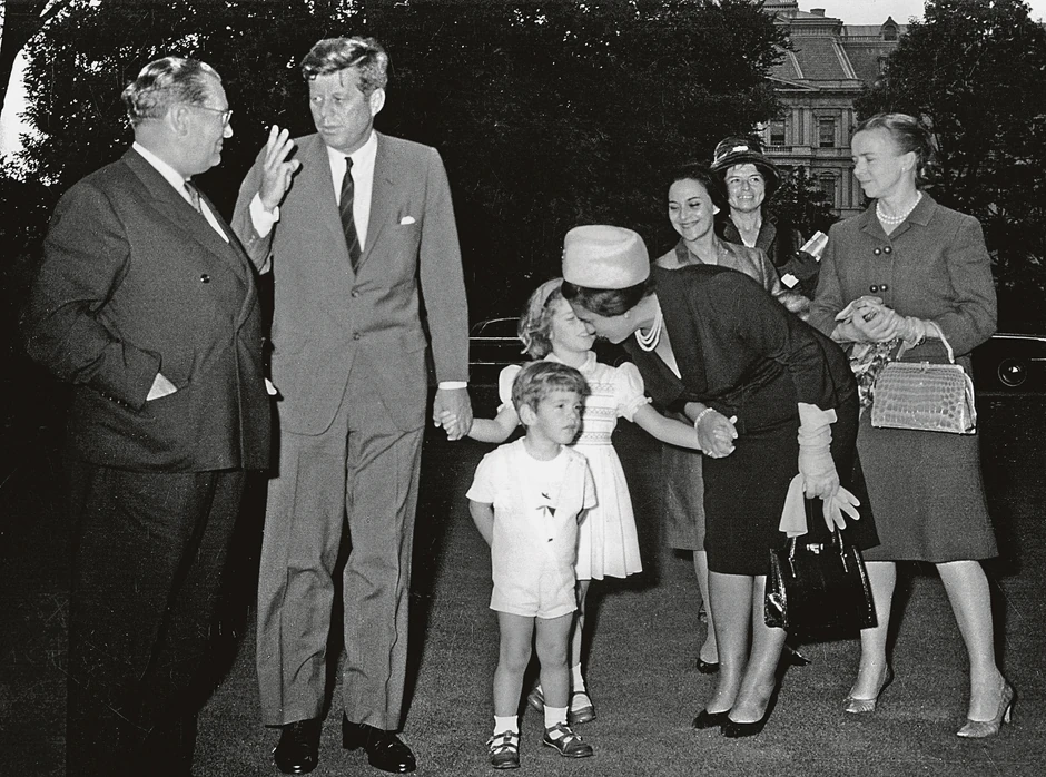 Predsednik Tito u šetnji s predsednikom Kenedijem i njegovom porodicom, pred odlazak iz Vašingtona, 17. 10. 1963. U ispraćaju predsednika Tita učešće su uzeli i deca predsednika Kenedija, Džon Junior i Karolina. Pored Jovanke Broz na fotografiji je i Virdžinija Fojzi Ras, supruga Dina Raska, državnog sekretara SAD, potom Miška Mićunović, supruga ambasadora Jugoslavije Veljka Mićunovića, i Zora Smodlaka, supruga Slovena Smodlake, šefa protokola predsednika Jugoslavije.