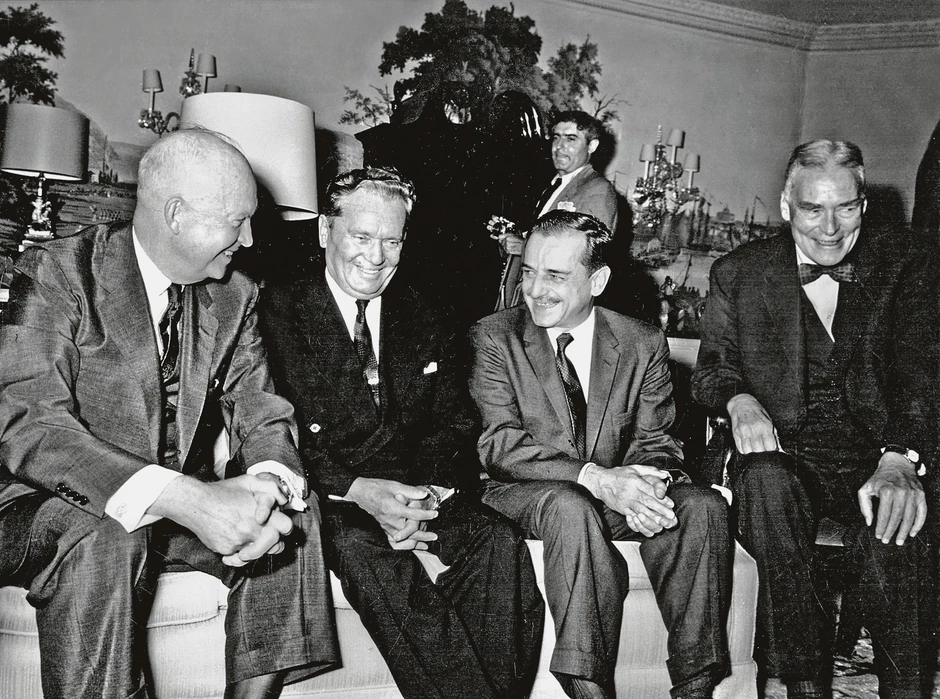 Sastanak predsednika Tita sa predsednikom SAD Dvajtom Ajzenhauerom u predsedničkom apartmanu na 35. spratu hotela „Valdorf Astorija“, tokom XV zasedanja Generalne skupštine OUN, Njujork, 22. 9. 1960. Sleva nadesno: Dvajt Ajzenhauer, J. B. Tito, Koča Popović, državni sekretar za inostrane poslove, i Kristijan Herter, državni sekretar.