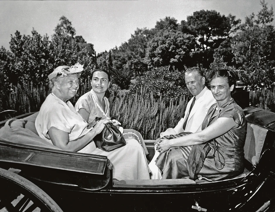Prijem Eleonore Ruzvelt, udovice bivšeg predsednika SAD Frenklina Ruzvelta: pred odlazak na ostrvo Vanga, Brioni, 19. 7. 1953. Pored predsednika Tita i Eleonor Ruzvelt, na fotografiji su Jovanka Broz i Marija Vilfan, supruga Jože Vilfana, generalnog sekretara predsednika.