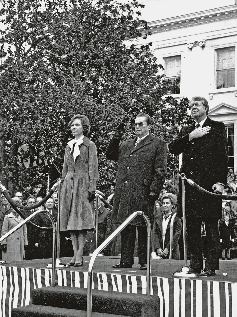Poseta predsednika Tita SAD: svečani doček pred Belom kućom i, susret sa predsednikom SAD Džimijem Karterom, Vašington, 7. 3. 1978. (sleva nadesno: Rozalin Karter, prva dama, Josip Broz Tito, Džimi Karter)
