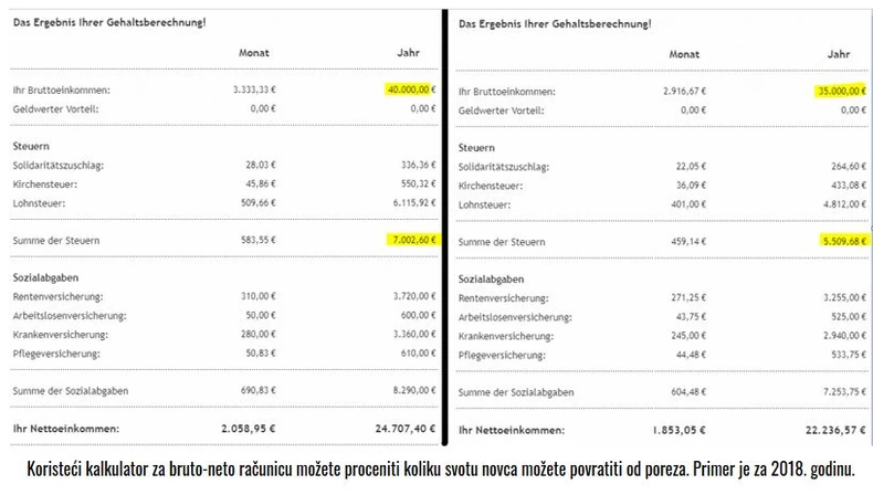 Sumu koju možete očekivati nazad možete sami dobiti koristeći bruto-neto kalkulutor. Uzmimo za primer bruto platu od 40.000 € i kažimo da živite u Berlinu, da ste neoženjeni i bez dece tj. prva poreska grupa, da ste pripadnik crkve i da plaćate crkveni porez, kao i da Vaše zdravstveno osiguranje naplaćuje dodatni doprinos od 1.3%. U tom slučaju porez možete videti na levom delu slike ispod odnosno 7.002,60 €. Ta suma se dobija zbirom tri poreza odnosno zbirom solidarnog poreza, poreza na crkvu i poreza na platu/porez na dohodak. Kažimo da ćete prijavit troškove koji smanjuju poreski namet u visini od 5.000 € i da će svi troškovi biti uvaženi. U tom slučaju oporezivi dohodak iznosi 35.000 €, a na desnom delu slike možete videti koliki bi bio porez na taj dohodak.