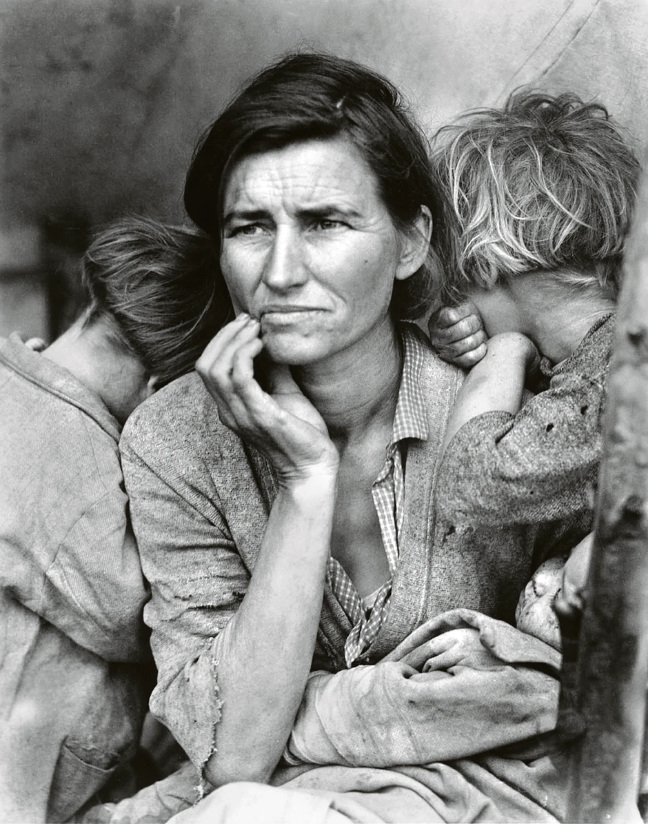 Pogleda uperenog u daljinu, namrštenih obrva s rukom koja podupire bradu, zabrinuta majka je sedela između dve devojčice zarivene u njen vrat, držeći na krilu bebu. Svi su neuredni, u istrošenoj i iscepanoj odeći. Tako bi se mogla opisati scena zabeležena objektivom kamere koja je postala simbol, a identitet majke i njena tužna priča otkriveni su tek godinama kasnije.