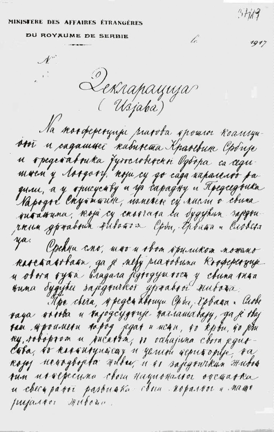 Srpska vlada premijera Nikole Pašića i Jugoslovenski odbor hrvatskog političara Ante Trumbića potpisali su 20. jula 1917. godine Krfsku deklaraciju, kojom su južnoslovenski narodi u Austro-Ugarskoj (Hrvati i Slovenci) zatražili ujedinjenje sa Srbijom u zajedničku državu pod nazivom Kraljevina Srba, Hrvata i Slovenaca na čelu sa dinastijom Karađorđević.