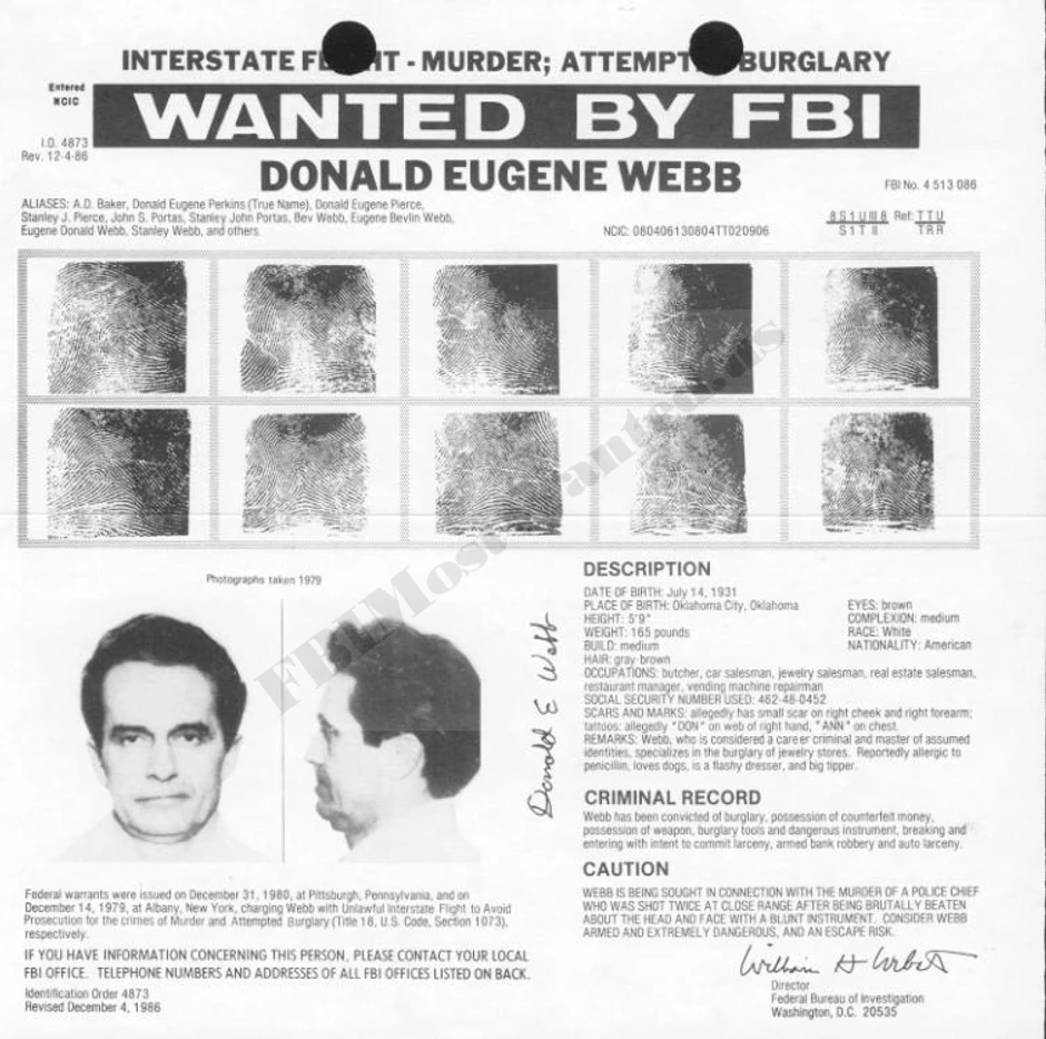 Za Donaldom Judžinom Vebom već je bila raspisana poternica zbog pljačke dragulja, kada je Gregori Adams, šef policije malog mesta Saksonburg, u Pensilvaniji, četvrtog decembra 1980. zaustavio njegov automobil radi saobraćajne kontrole. Veb je navodno dao Adamsu vozačku dozvolu pokojnog čoveka, čijom se udovicom oženio.