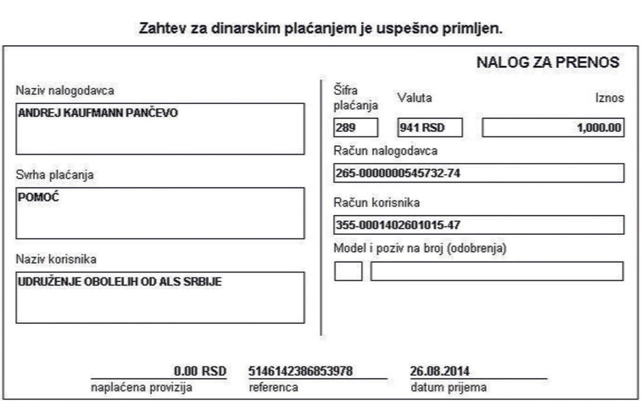 U Srbiji trenutno od te bolesti boluje 150 ljudi, a njihovo lečenje iziskuje dosta novca. Za sve one koji bi da pomognu, broj žiro računa Udruženja obolelih od ALS Srbije je 355-1402601015-47 (Vojvođanska banka Beograd).