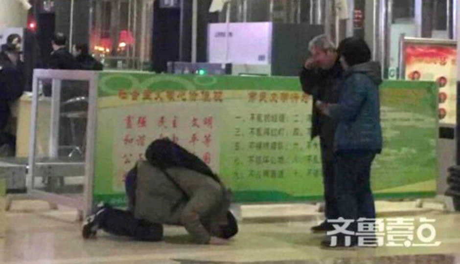 Žang Jinli, 46-godišnji muškarac, prikazan je kako kleči ispred vremešnog oca moleći ga za oproštaj što je primoran da ga napusti. Iako je rođen u Zibu, Žang već dugo sa porodicom živi u Pekingu koji je od ovog mesta udaljen nešto više od tri sata vožnje.