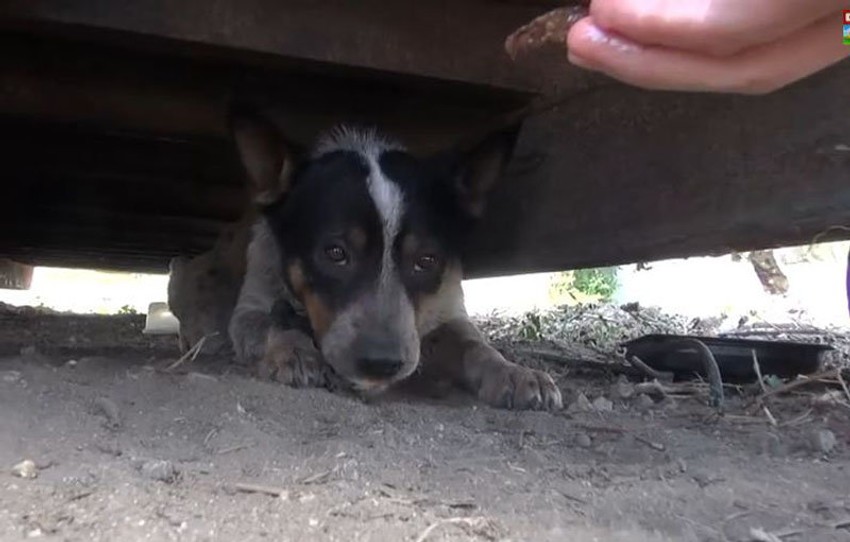 Pas je toliko uplašen da bi se šćućurio ispod kontejnera čim se neko pojavi u njegovoj blizini.