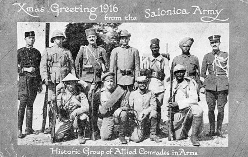 Božićna čestitka za 1916. napravljena kod Soluna spojila je u jednu fotografiju tadašnje saborce: Grka, Britanca, Srbina, Italijana, Alžirca, Indijca i vojnika Kraljevine Crne Gore (gornji red), te Vijetnamca, Rusa, Francuza i Senegalca (donji red)